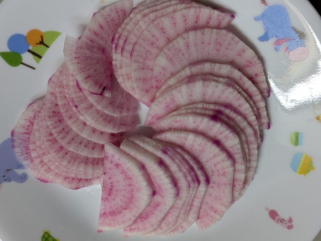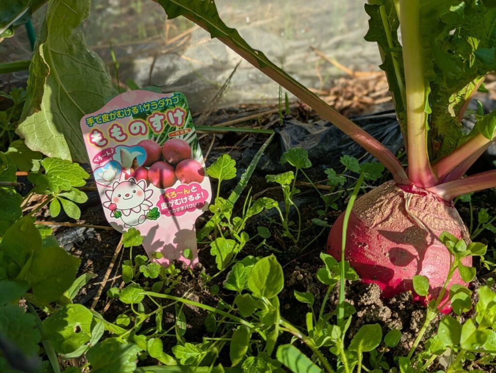 もものすけは、種まき後、芽が出たところを虫に食べられてしまいました。苗が売られているのを見つけ購入、大きくなり食べ頃になりました。薄くスライスし、塩を振っていただきました。 (参考 JAやさと有機栽培部会)
