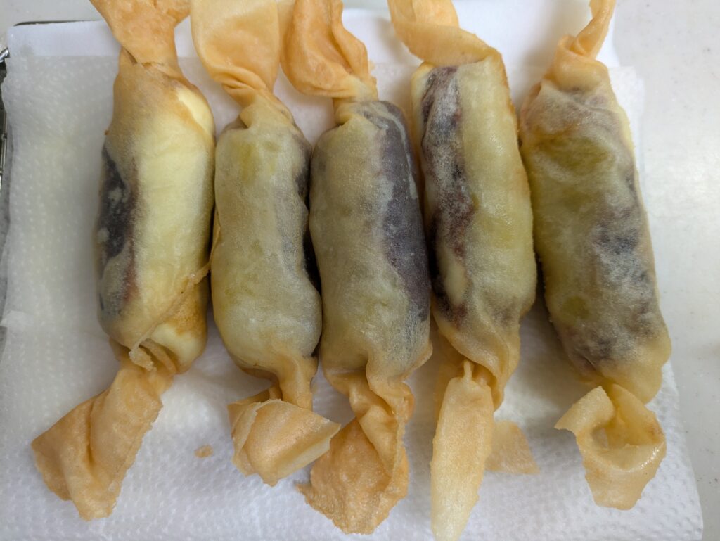 春巻きの皮で包み、揚げる